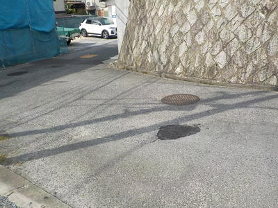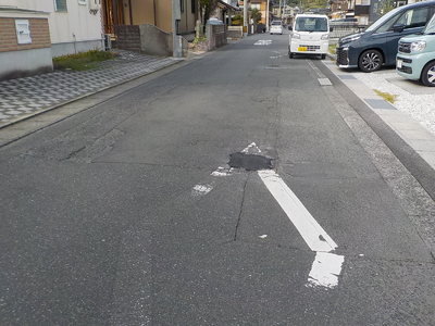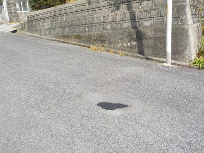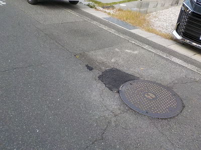 市道の真ん中にある下水道マンホールの周辺が崩れかけている