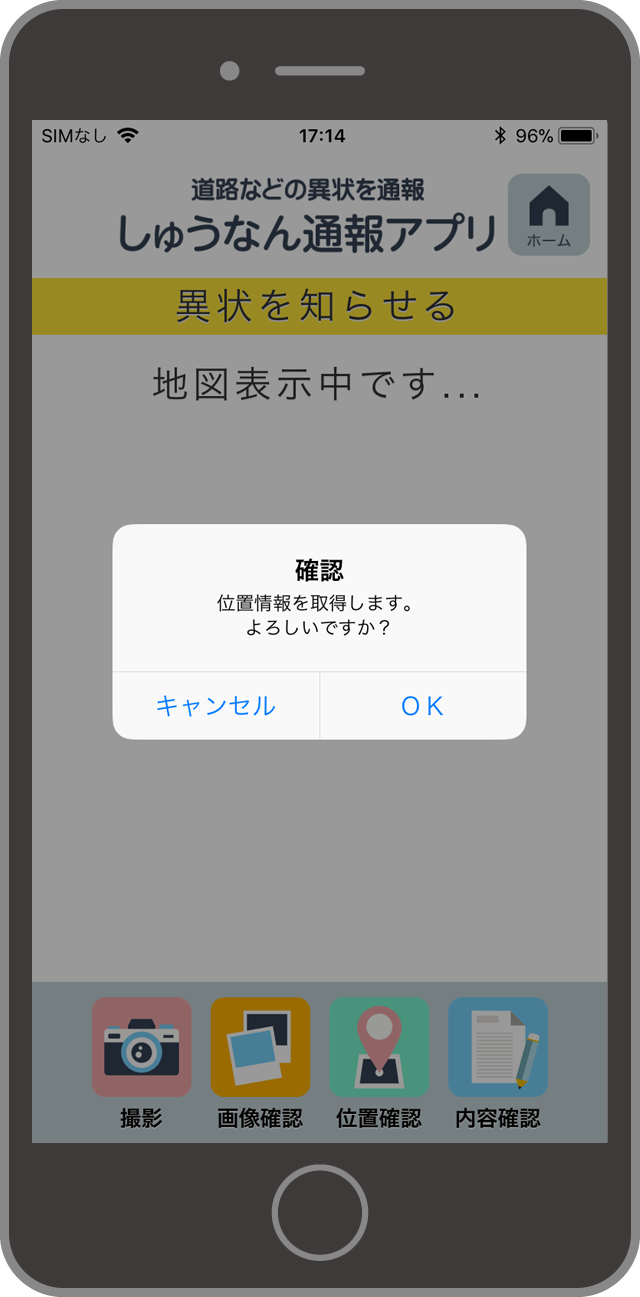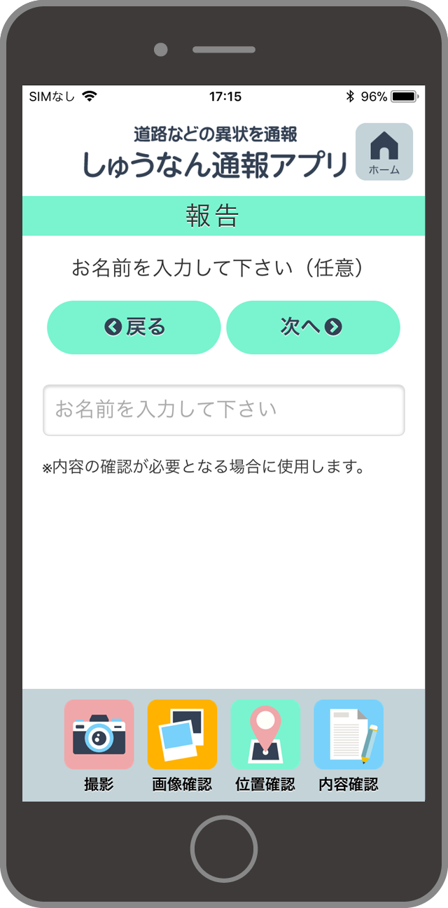 カメラが起動しますので、異状箇所が画面に映っている状態で画面下中央部のホームボタンを押し、撮影を行ってください。撮影後、『次へ』ボタンをタップしてください。撮り直す場合は『再撮影』ボタンをタップし、再度撮影してください。