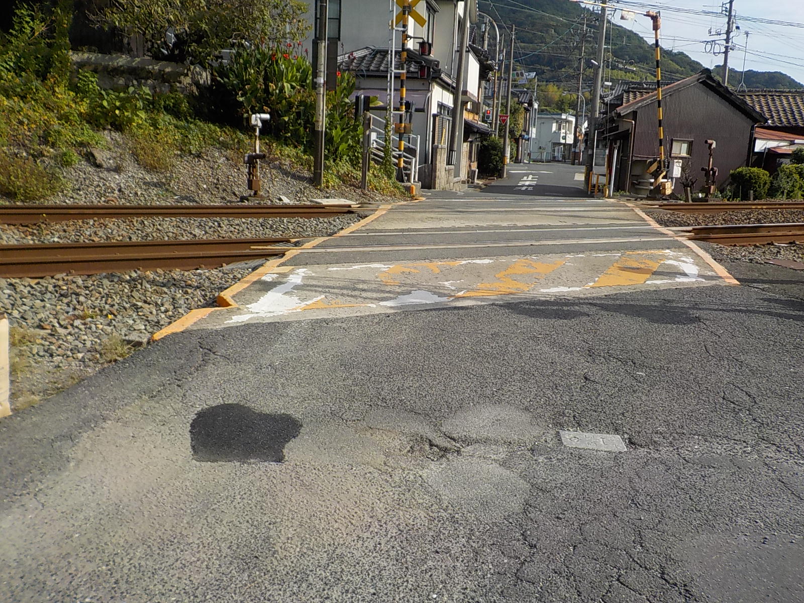いつもお世話になります。西町第二踏切の御姫町側に穴凹があります。車が停止する場所の穴ですので、タイヤがちょうどはまり込むこともありますので、早目の対応をお願いします。
