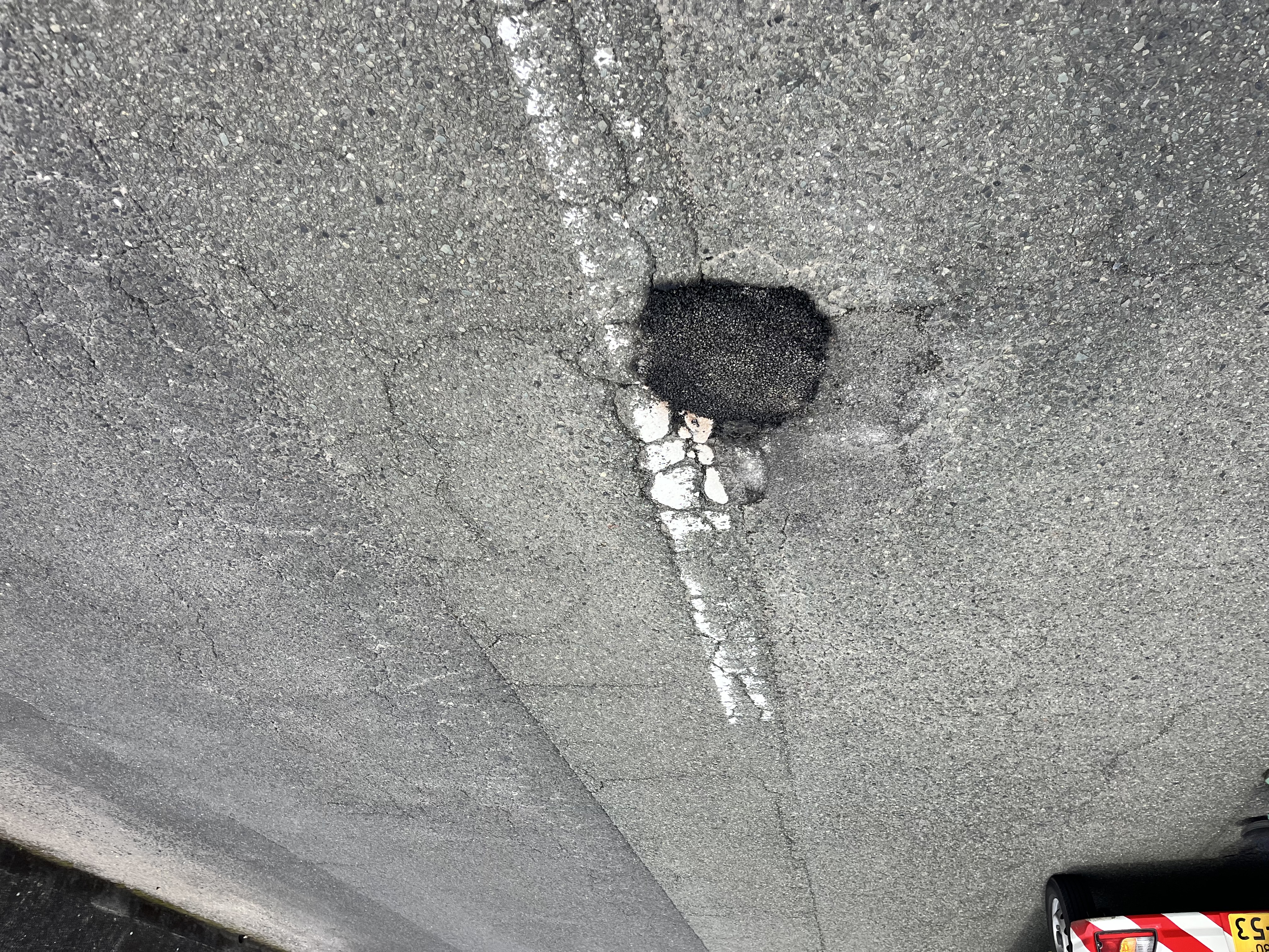 夜市川沿いの市道中央の穴ぼこです。通行量も多い道ですので、補修をお願いします。